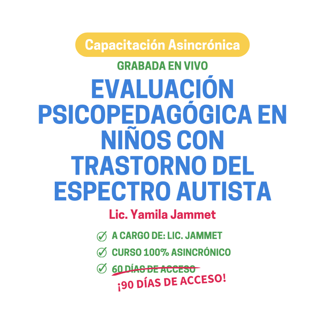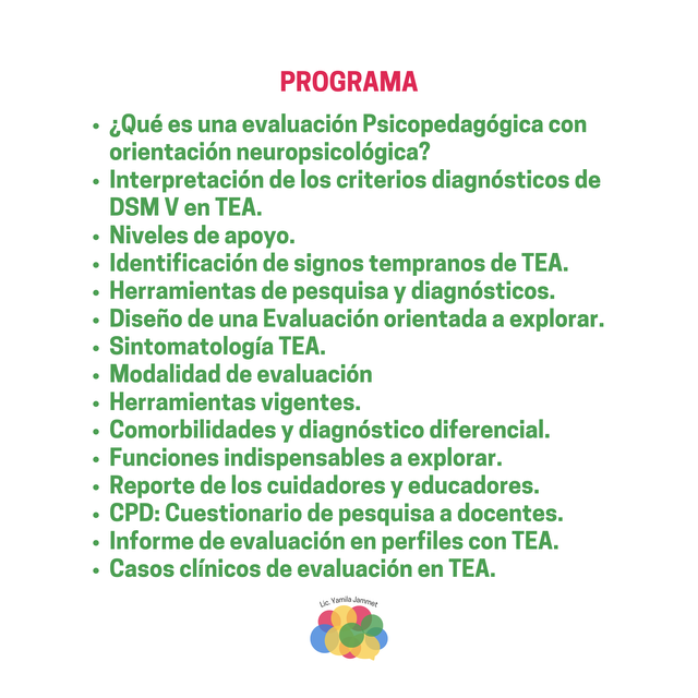 1. ¿Qué es una evaluación Psicopedagógica con orientación neuropsicológica? 2. Interpretación de los criterios diagnósticos del DSM V en TEA. 3. Niveles de apoyo. 4. Identificación de signos tempranos de TEA. 5. Herramientas de pesquisa y diagnóstico 6. Diseño de una evaluación orientada a explorar. 7. Sintomatología TEA 8. Modalidad de evaluación. 9. Herramientas vigentes. 10. Comorbilidades y diagnóstico diferencial. 11. Funciones indispensables para explorar. 12. Informe de los cuidadores y educadores. 13. CPD: Cuestionario de pesquisa a docentes. 14. Informe de evaluación en perfiles con TEA. 15. Casos clínicos de evaluación en TEA. Orientado a: Profesionales de la Psicopedagogía. Profesionales del área de la Salud o Educación. Estudiantes avanzados del área de la Salud o Educación. Incluye: Certificado de Participación. PDF con diapositivas + Material bibliográfico.