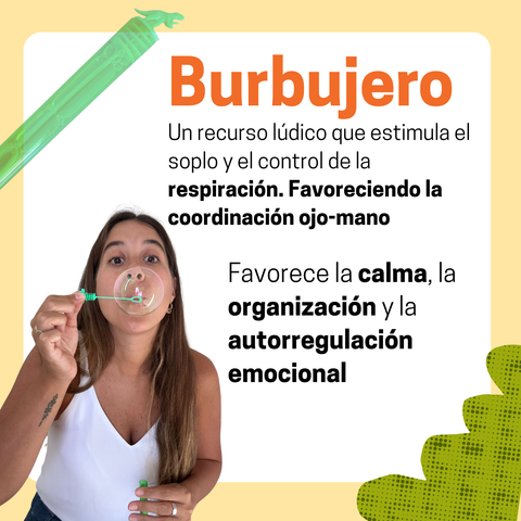 Un recurso lúdico que estimula el soplo y la coordinación respiratoria. Favorece la calma, la organización y la autorregulación emocional. Invita a sostener la atención visual en el recorrido de las burbujas y promueve la interacción social en contextos de juego compartido.